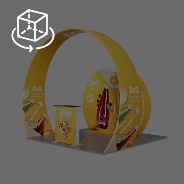 This 10x10ft trade show booth features a unique tapered arch with a double-framed 3D circle backdrop, offering a stylish and dimensional look. Perfect for fashion-forward trade shows, high-end business summits, or creative product launches, it serves as an ideal stage to showcase your brand’s charm and product features, drawing attention and aiding boosting business.