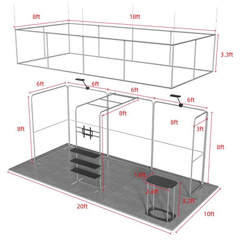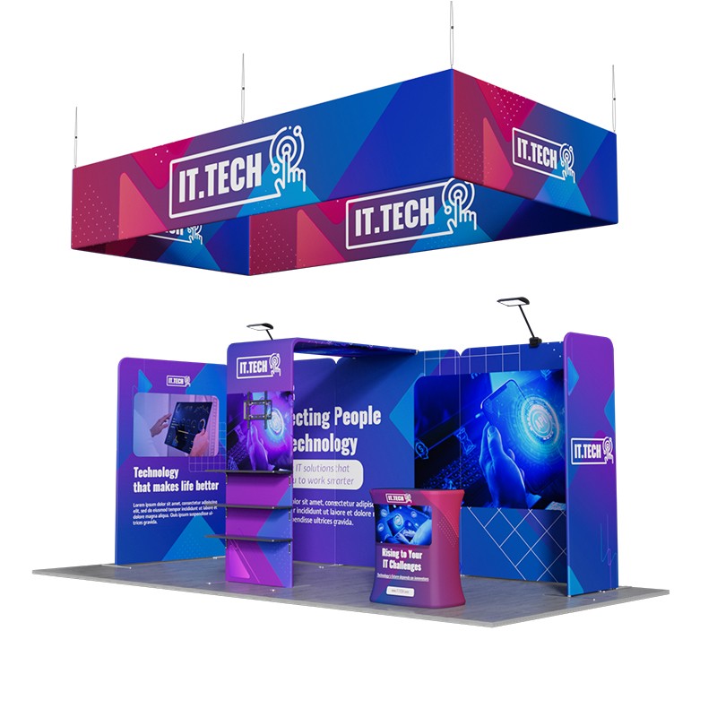 This 20×10ft trade booth features a well-planned spatial layout and an efficient display method, which can quickly capture the attention of the audience. With ingenious lighting design, vivid product demonstrations, and interactive conversation areas, you can convey the core values and competitive advantages of your products to the audience in a short time, thus effectively enhancing the display effect.