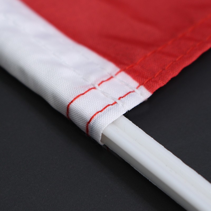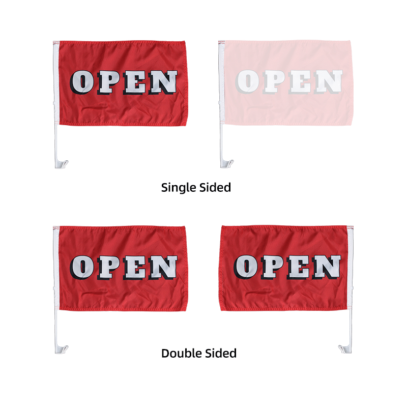 And we have up to 5 different fabrics for making these car flags. 100D Polyester and 110g Knitted Polyester are the most commonly used fabrics for flags, which are economic, lightweight but still durable enough for outdoor use. If you want your flags to be more outstanding than the rest, the 115g Fluorescent Knitted Polyester is recommended. This fabric will make your brand brighten even in dark light. If you want your logo/text to be double-sided printed on a single-layer fabric and hope both sides read correctly, you can choose Duplex Printable Blockout Polyester.