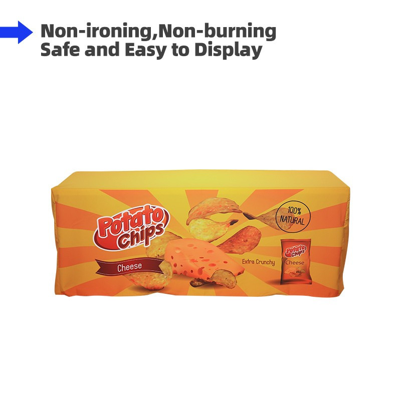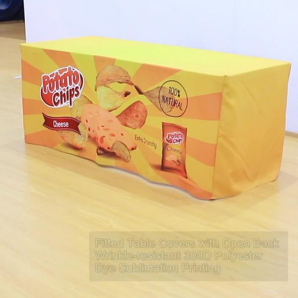 This kind of fitted table cover is sewn down the corners to match the shape of the table and offer a clean, sleek presentation. If you are preparing for an exhibition, it is suggested that you choose our fitted table covers with an open back which could provide storage for your small objects, make your table platform clean.