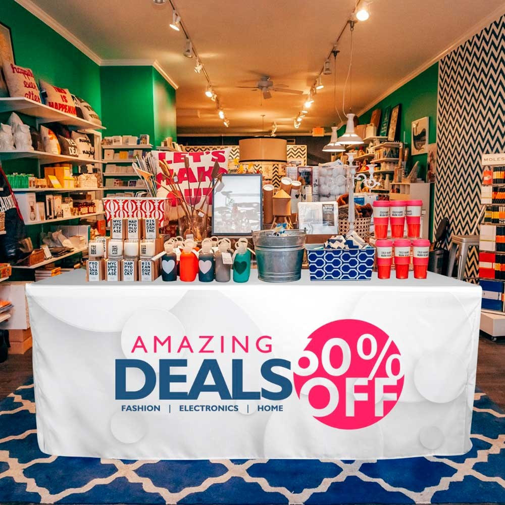 Our premium fitted table covers with open back help your company create a professional image at a trade show or seminar. You can add your logo or some graphics to custom printed tablecloths that will be printed in full color. Not only does it give you a clean, classic look, but it also provides the flexibility to meet almost any need. You can put your things under the table, it’s easy to reach. Let’s start designing a custom three-sided fitted table cover for your next event!