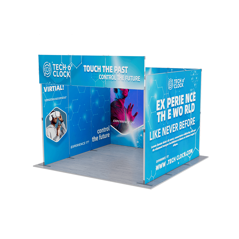 This innovative display system includes a main backdrop wall, two side panels, and a overhead header. The main backdrop wall serves as the centerpiece of your display, providing a large, uninterrupted canvas for your graphics and branding. Two side panels of the same size as the backdrop wall extend the visual impact of your display, creating a cohesive and immersive environment. And the overhead header sits above the main backdrop, providing additional space for branding, logos, or messaging that will catch the eye of passersby.