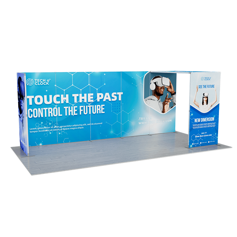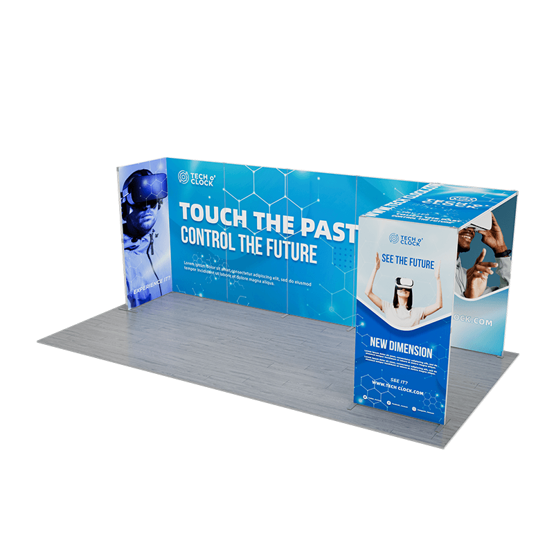 This versatile display solution is perfect for trade shows, conferences, and promotional events, providing a professional and eye-catching presentation. The kit includes a large back wall connected to a side panel, along with a screen made from two panels connected at a 90-degree angle, placed adjacent to the back wall. This configuration creates a dynamic, multi-dimensional setup that draws attention and engages visitors.