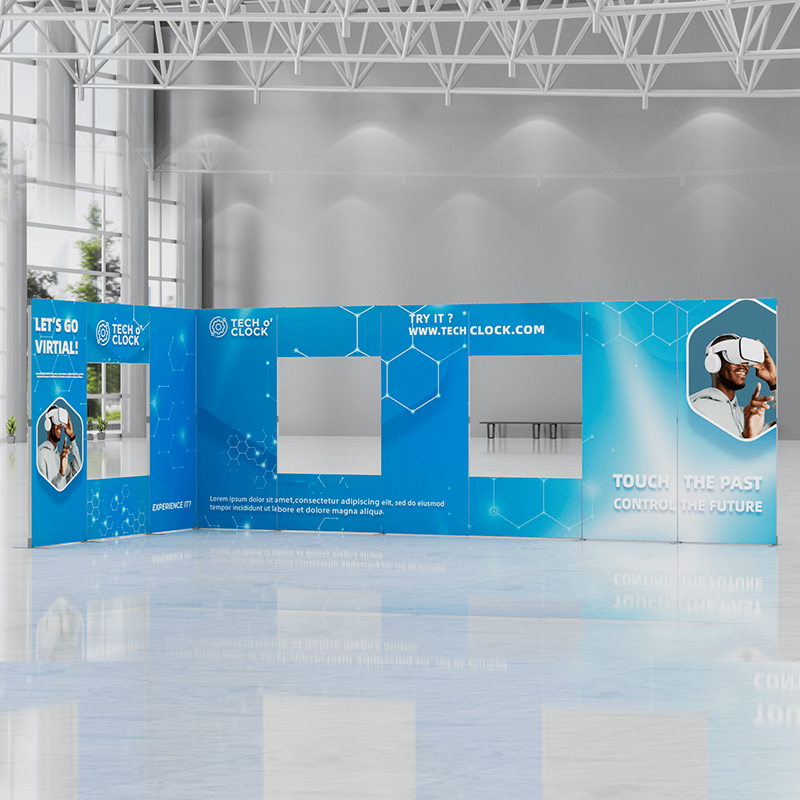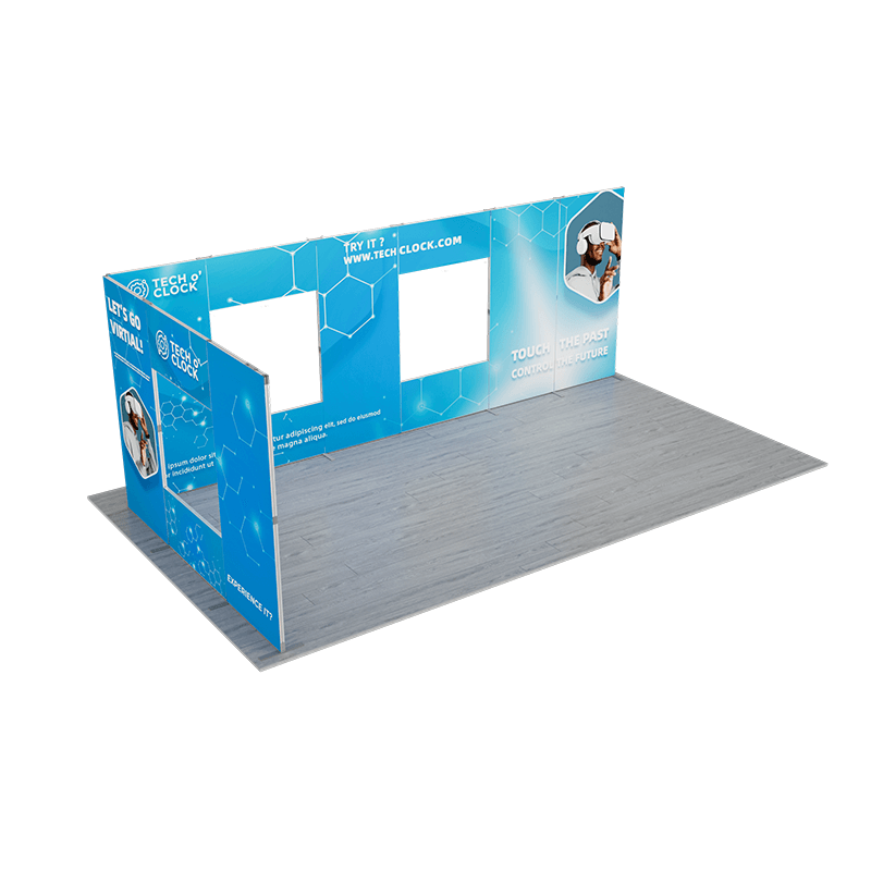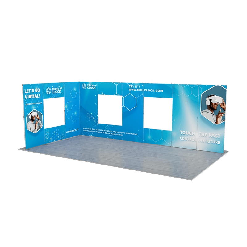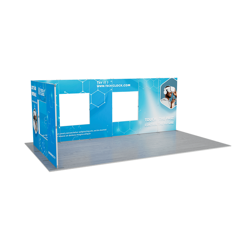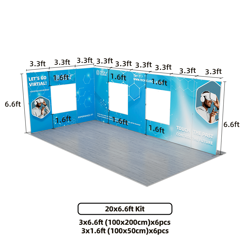 The kit includes two vertically connected back walls, with the longer back wall featuring two windows and the shorter back wall featuring one window, creating a unique and eye-catching design. The two vertically connected back walls provide ample space for branding and graphics. This configuration adds height and visual interest to your display.
