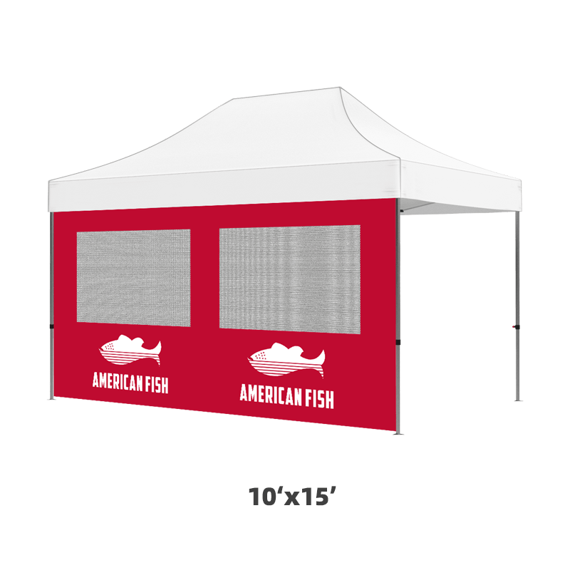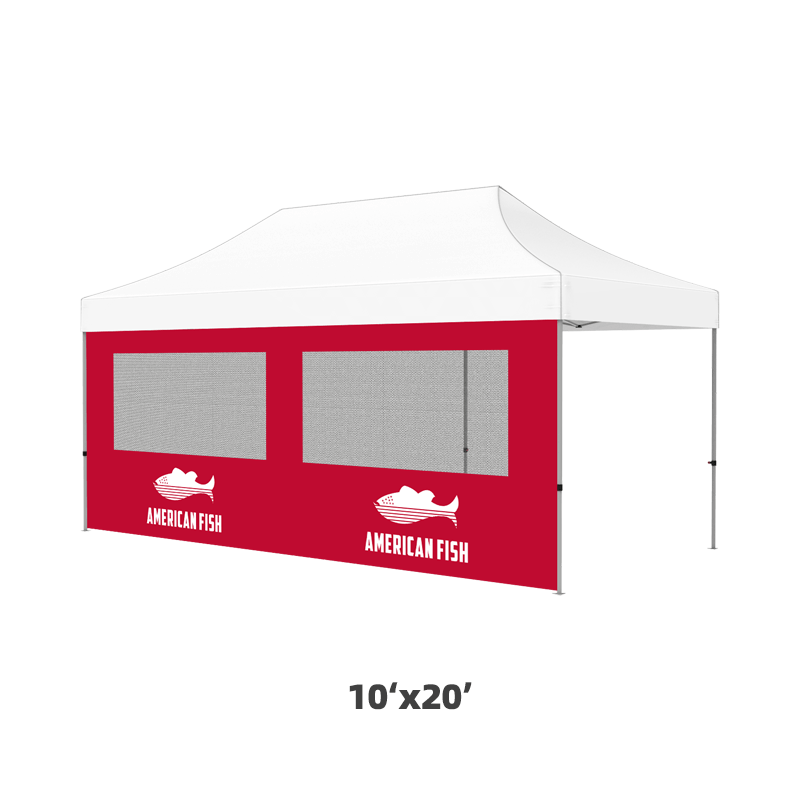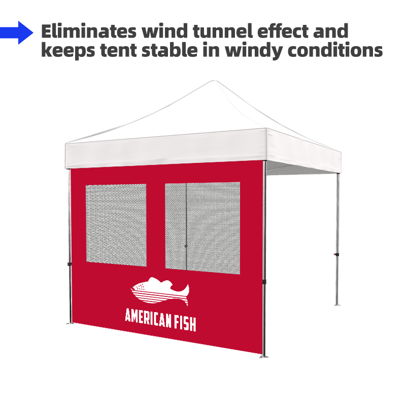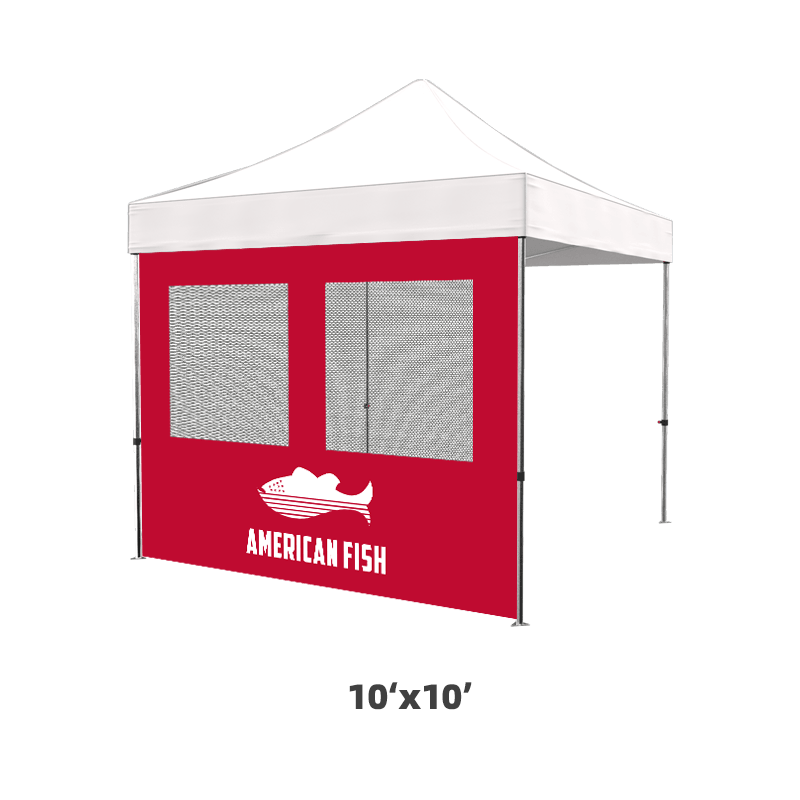 All our full walls come with Velcro on the top edge (both front and back sides), so you can easily attach them to your canopy tops. On the fabric, you can print a design to match your tent top. You can choose single-sided or double-sided print. As the Velcro is sewn on both the front and back sides, You can choose single-sided or double-sided.