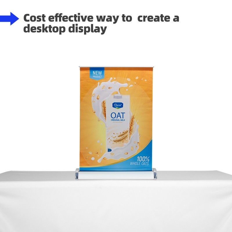 The mini roll up is a great way to promote your event or business while saving space. It can be placed on a tabletop or desktop to present your product message in a high-impact format. It is commonly used for advertising and marketing at exhibitions, conferences, seminars, or in-store promotions.