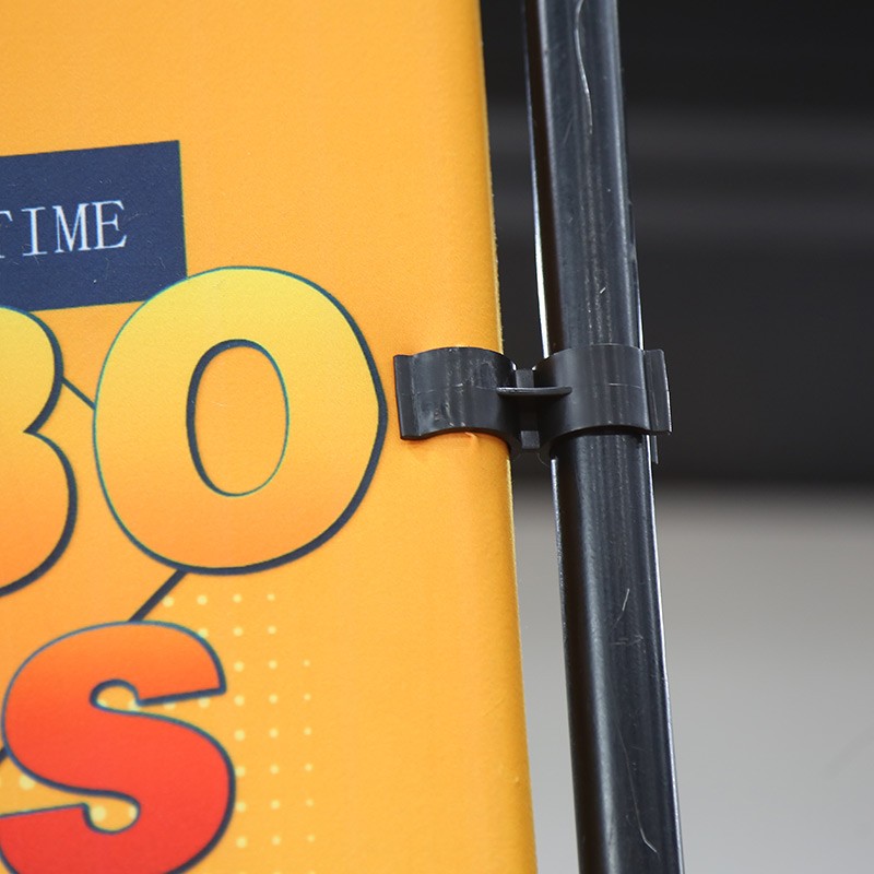 The frame is divided into smaller tubing parts for the convenience of transport and storage. With the push-button connectors, the tubes can be easily assembled step by step into a frame. When the frame and banner are ready, this side vertical panel can be attached to the tabletop banner stand easily by the clamps.