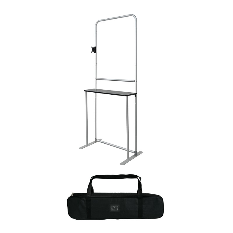 This is a replacement hardware kit for our Tension Fabric Stand With LCD Board. The kit includes an easy-to-setup aluminum frame, a mount for a monitor/TV, a plastic shelf, and a portable carry bag. The frame is made from durable, lightweight aluminum tubing that is bungee-corded together for easy setup. The mount can support a 32″ (or smaller ) display, giving you even more visual impact!