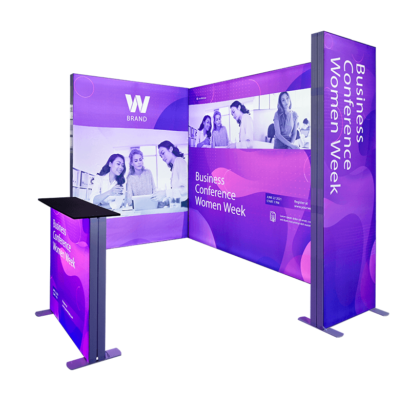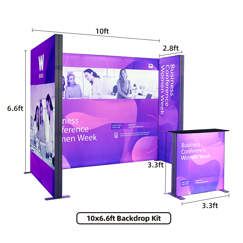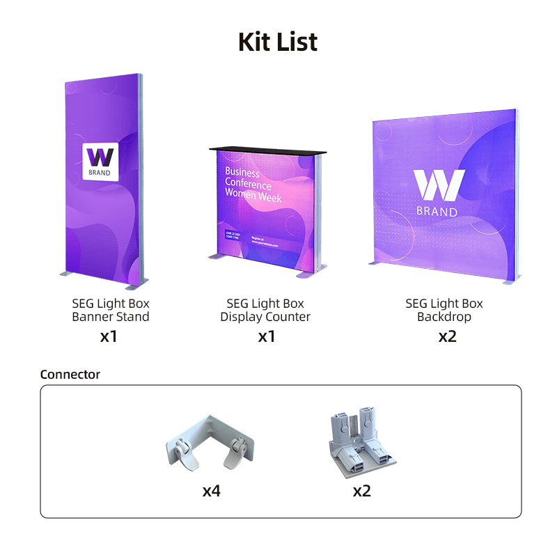 Perfect for businesses looking to create an unforgettable experience, this comprehensive package includes everything you need: two versatile backdrops, a practical side wall banner stand, and a sleek display counter. The SEG frames seamlessly integrate with the fabric graphics for a sleek and professional look. The built-in LED lighting system ensures vibrant and even illumination, captivating your audience from every angle.