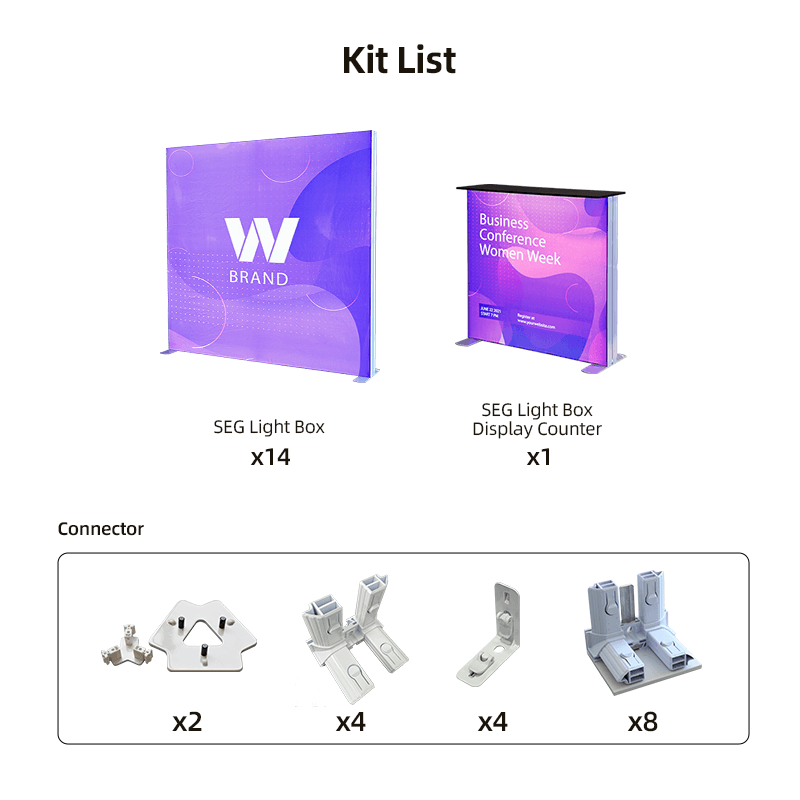 This Tradeshow SEG Modular Lightbox Display Kit offers a complete solution for creating a professional and impactful presence at trade shows or exhibitions. Its modular components, sleek design, and attention to detail make it a versatile and effective tool for showcasing your brand and engaging with potential customers.